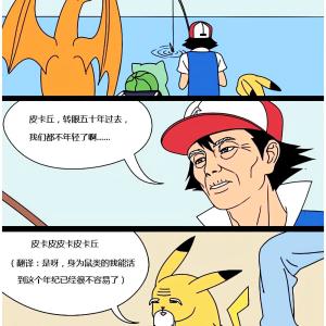 转眼五十年过去了,小智、皮卡丘、妙蛙种子、喷火龙、巨钳蝎和杰尼龟相约在海边钓鲤鱼王,步入老年的他们是什么样子呢?