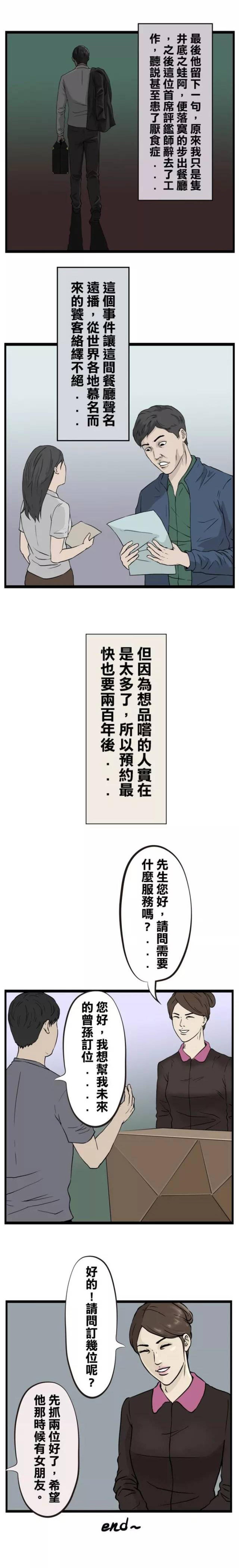在这条巷子里,有一家世界闻名的餐厅,据说世界顶接美食家品尝过餐厅的食物后,从此辞掉工作,患上了厌食症。前来订餐的人络绎不绝,据说,有人已经给自己的曾孙子订了双人套餐。