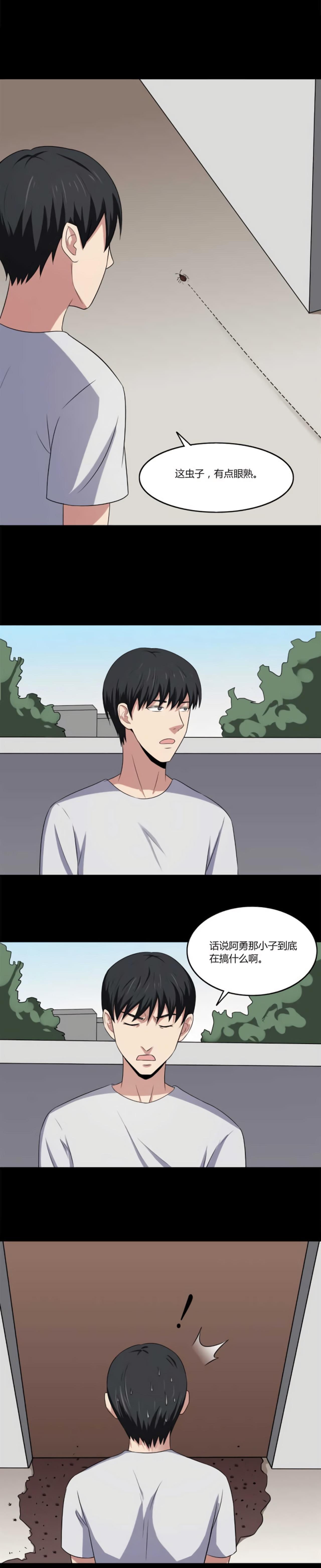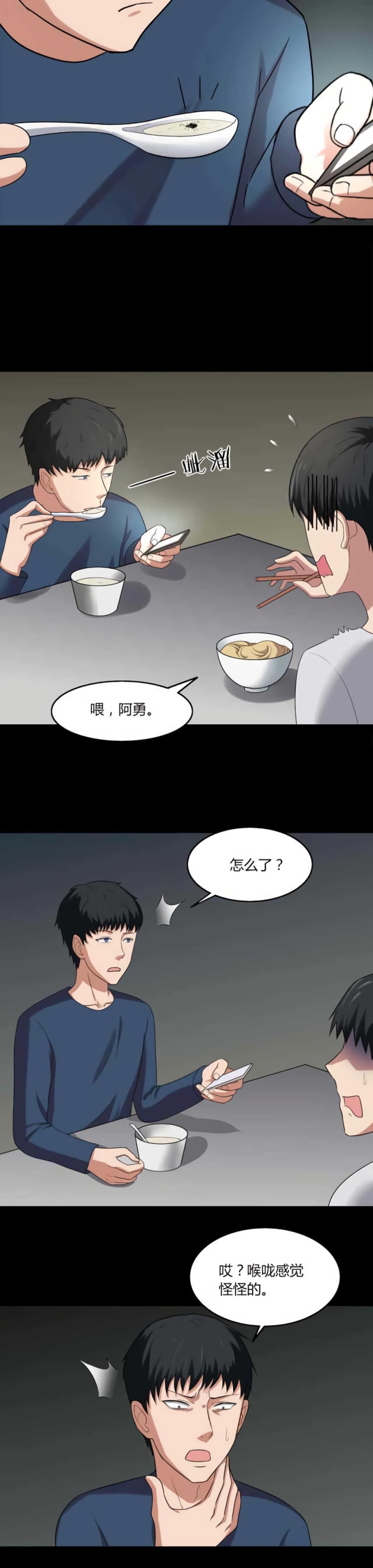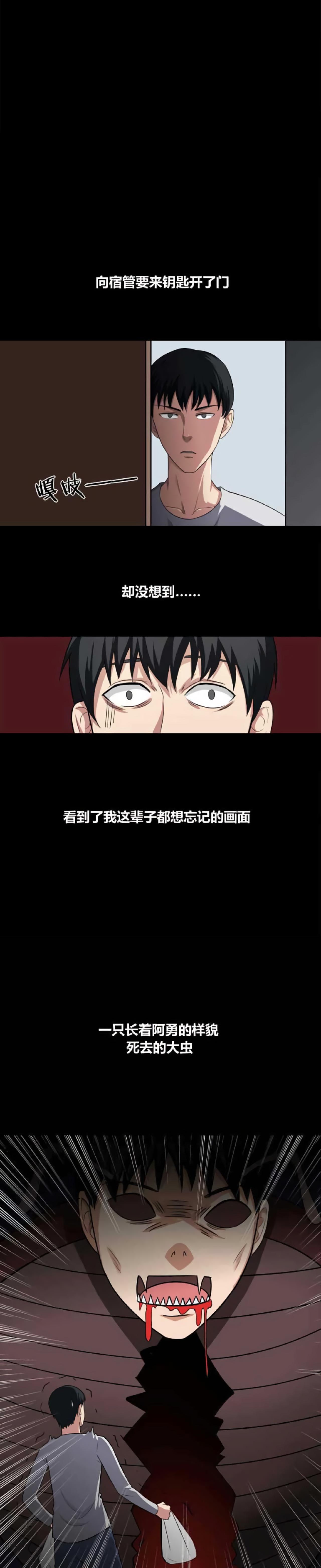 吃饭的时候,阿勇只顾着看手机,吞了一只虫子。过了好几天,阿勇感觉后背很痒,痒的感觉越来越强烈,阿勇只能让舍友帮忙带饭。当舍友回宿舍时,看到了可怕的场景。一只小虫子引发的校园恐怖事件。