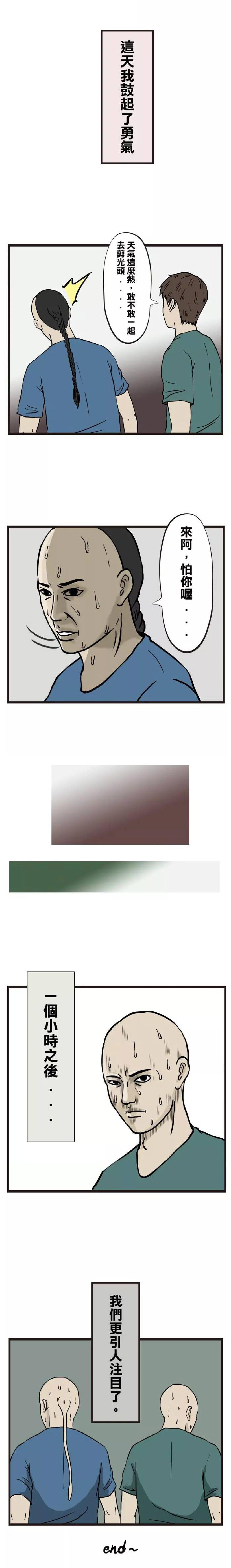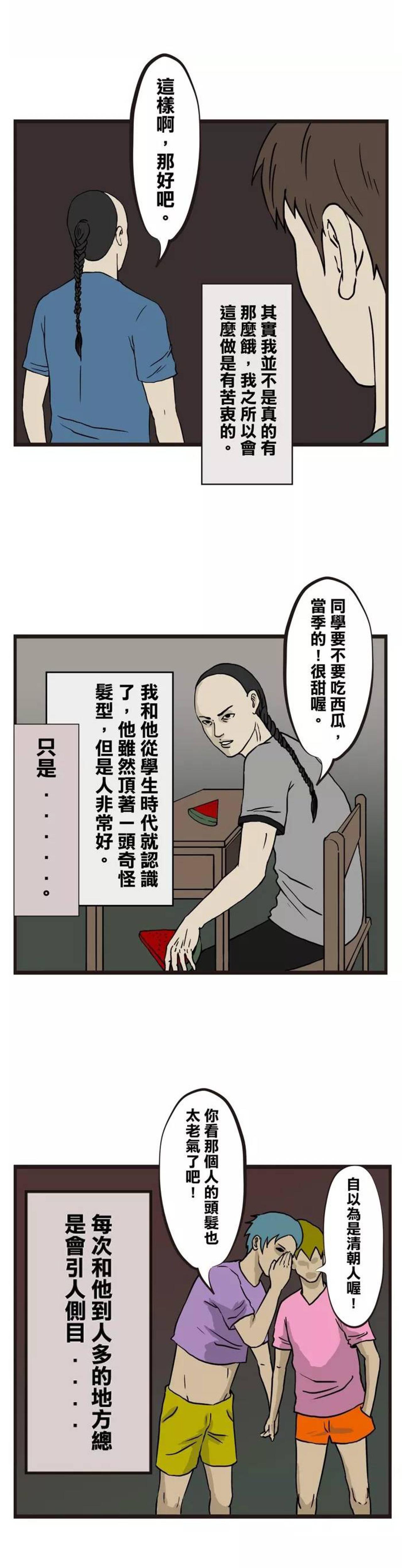 男主角有个好朋友,对男主角特别好,总是请他吃饭。但是朋友总是留着清朝的长辫子,走在街上,常常成为路人议论的焦点。这几天,天气炎热,男主角鼓起了勇气,请朋友去理发,两人都剃成光头。于是他们更加引人注意了。