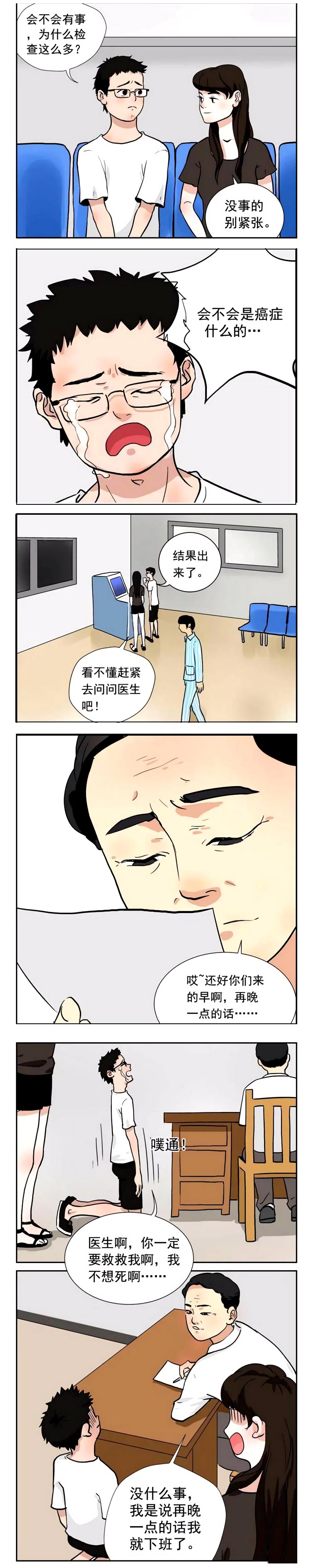 男主局这阵子肚子总是疼,妻子建议他去医院检查,经过挂号、彩超、抽血,夫妻俩将检查结果拿给医生看,医生说:幸亏你们来早了,再晚一点的话。男主角哇的一声哭了。