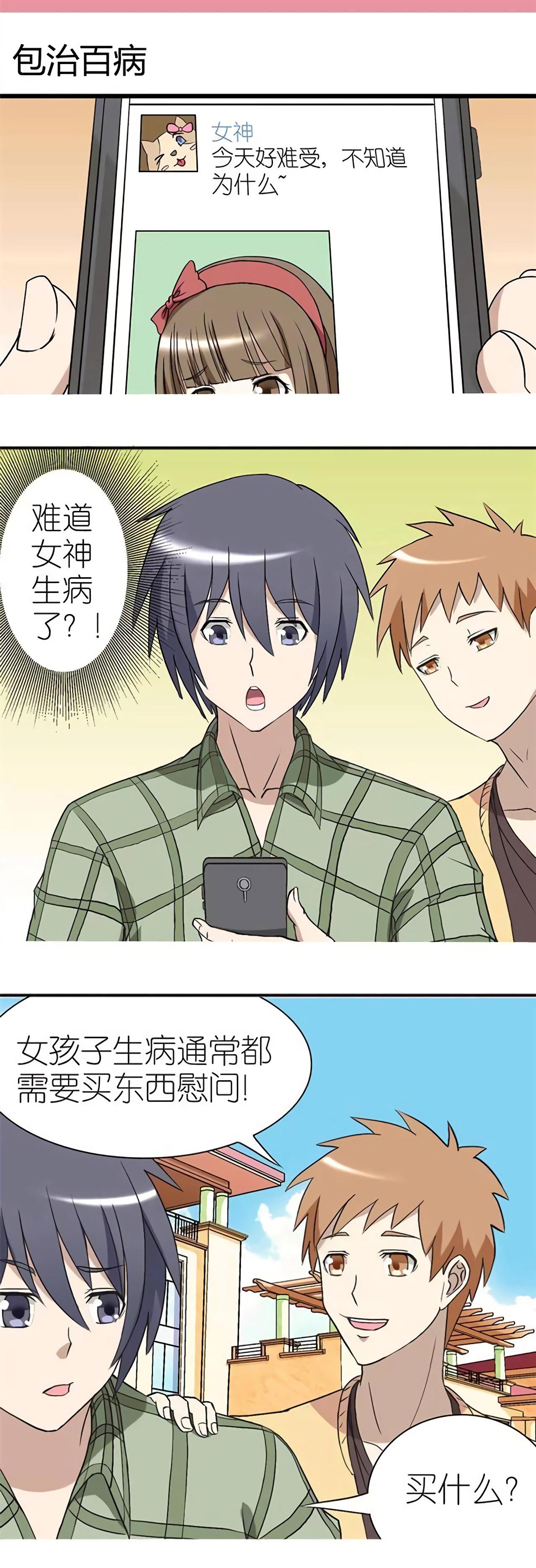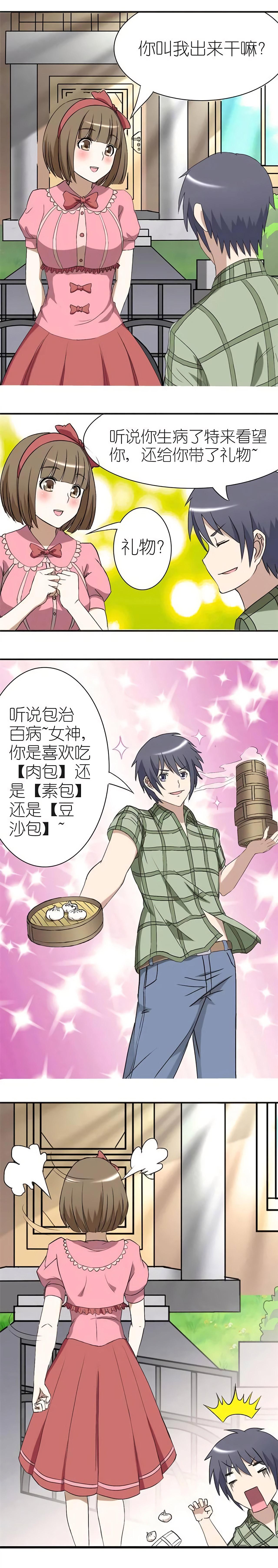 女神发朋友圈,说今天好难受,好友给男孩建议,用“包”治百病的方法来讨好女神。于是男孩去女神家拜访,给女神带来了小礼物。