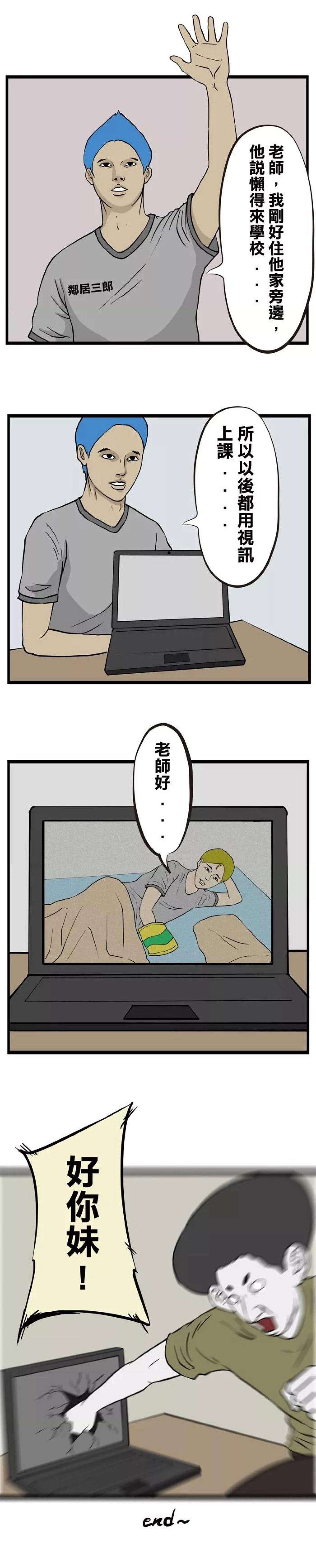 大家好,今天班上来了一位转校生,他叫懒惰三郎,下面请懒惰三郎自我介绍,好,懒惰三郎懒得做自我介绍了。开学要点名,老师发现懒惰三郎不在,懒惰三郎的邻居告诉老师,懒惰三郎这学期都要用远程视频的方式上课了,原因是,因为懒得起床!