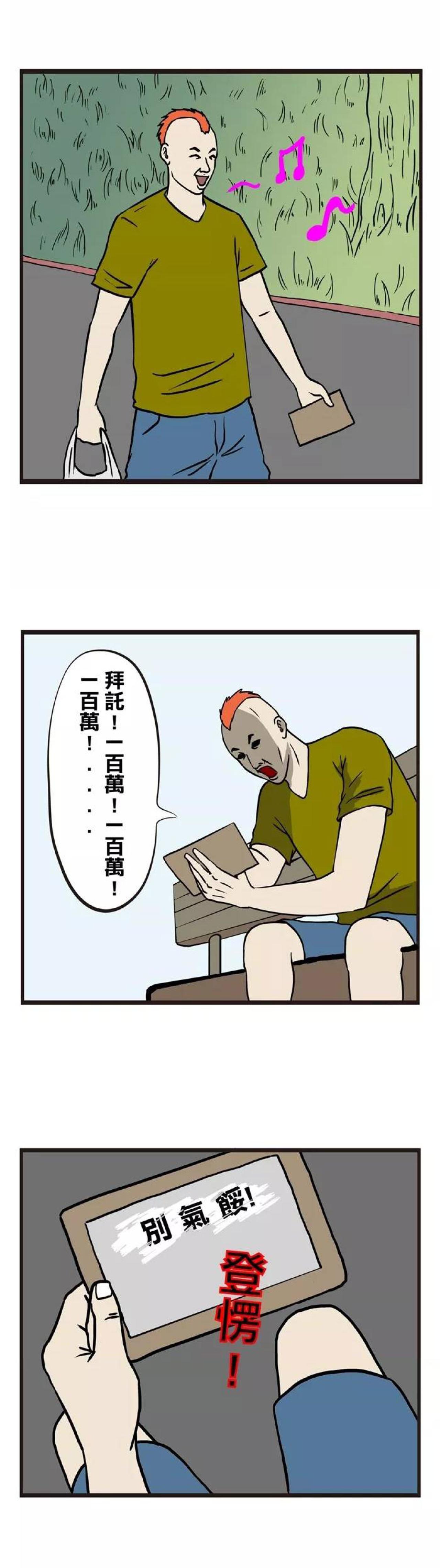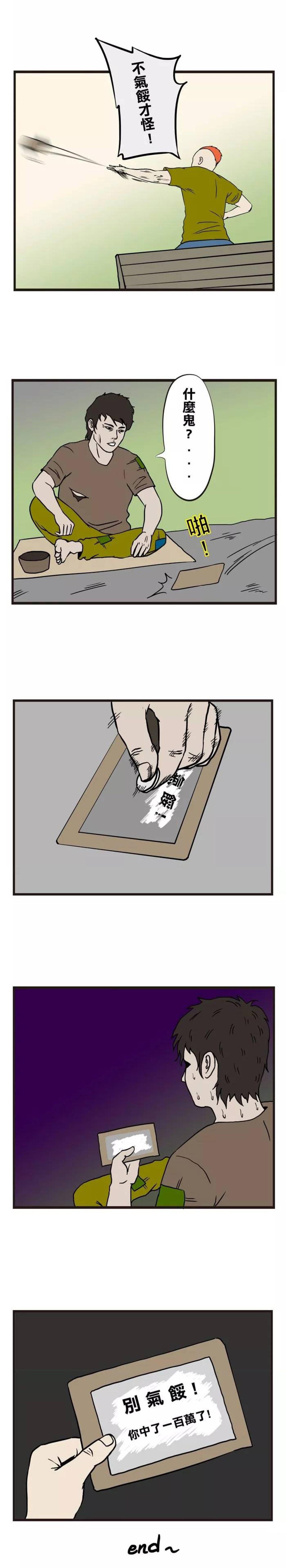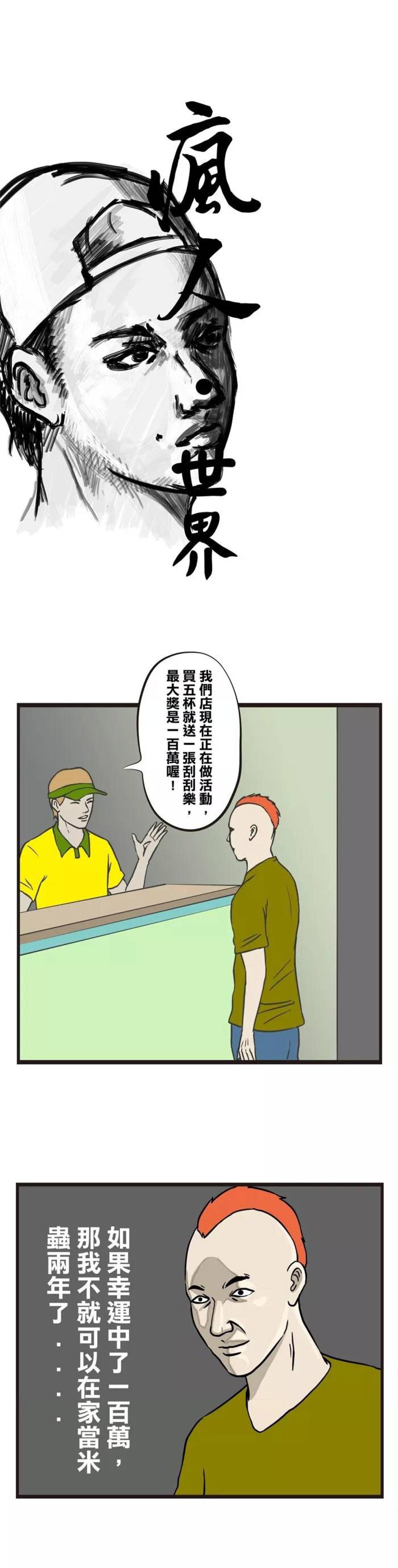 男主角就买奶茶,奶茶店正在举办活动,买5杯就送刮刮乐一张,最大奖是100万哦!男主角果断买了一张,刮开卡片,里面写着三个字:别气馁!