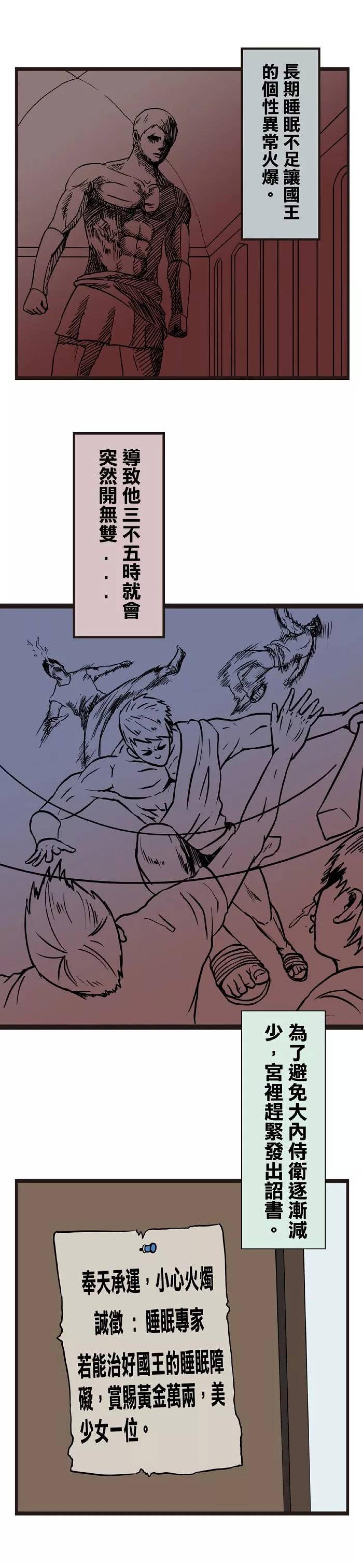 英勇善战的国王一直受失眠的困扰,他有非常严重的失眠,长期睡眠不足的个性,让国王的性格非常暴躁。国王向民间征集治疗失眠的方法,各路高人前来试验,但都没有让国王睡着,直到有一天,有一个披着深色衣服的男子来到王宫。