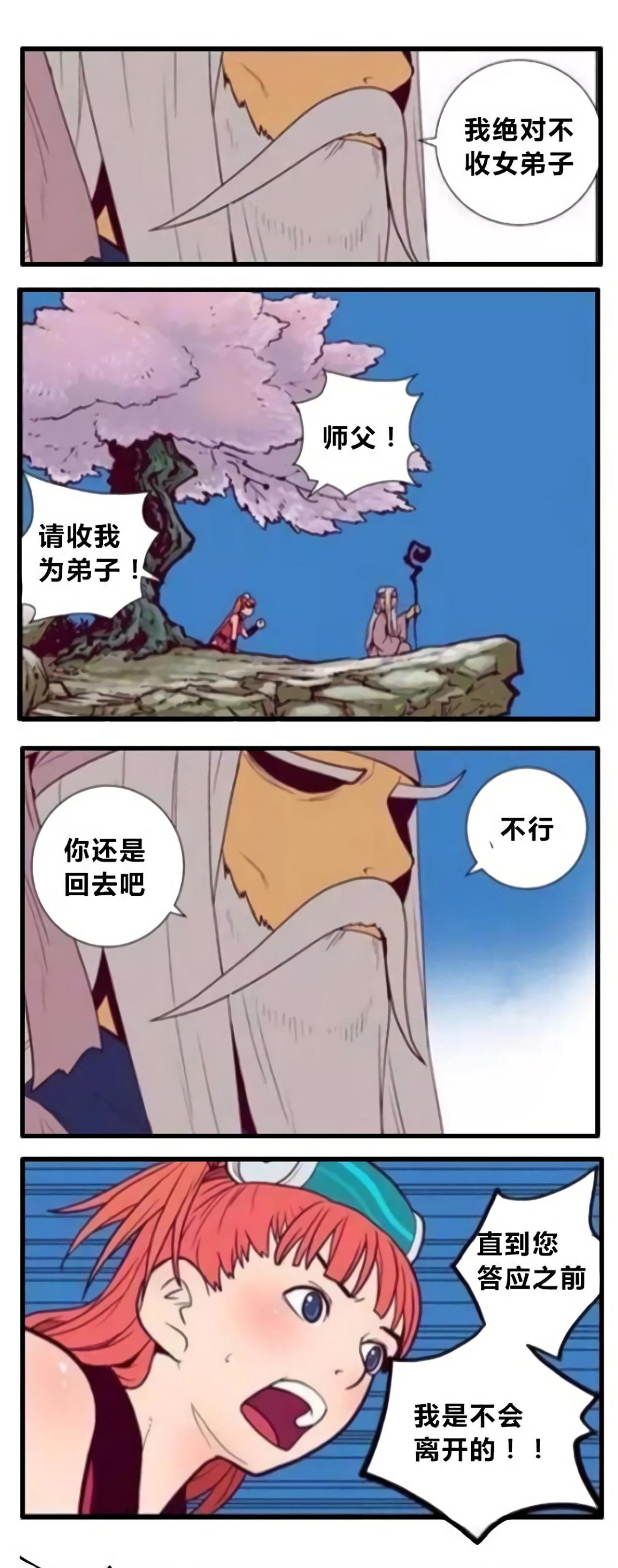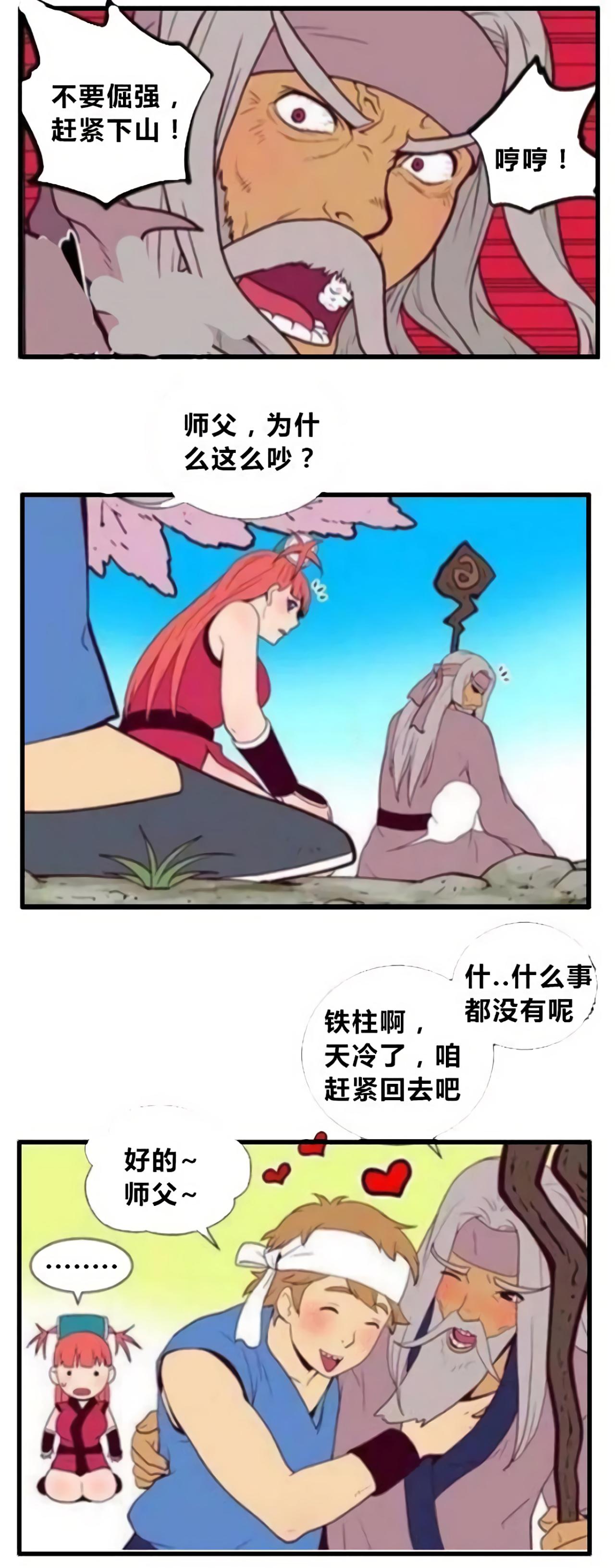 女孩为了上山拜师,跪了一天,白发苍苍的老人都不答应收她为徒。女孩一直跪着,说直到师傅答应前,自己都不会离开。这时,老人本来的弟子铁柱来了,女孩看出了基情,原来师傅不收女徒弟的原因是这个。