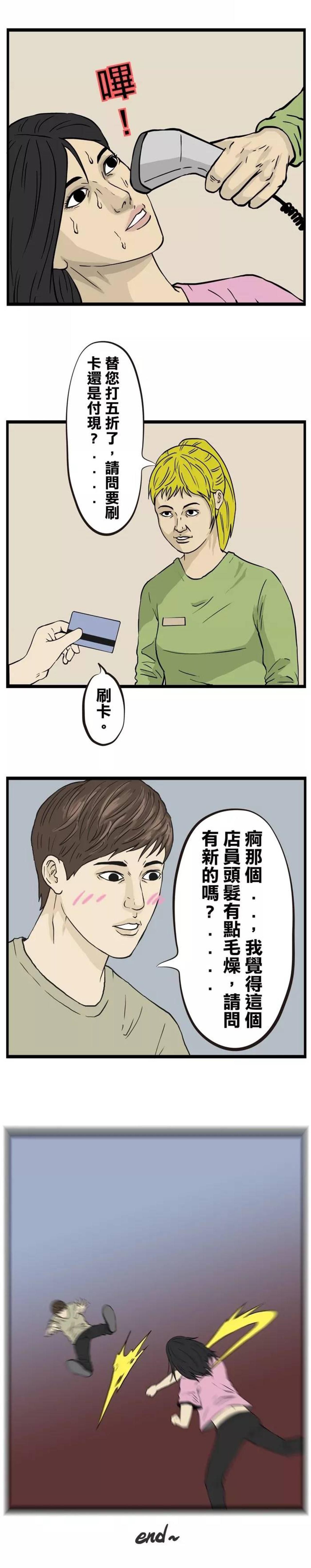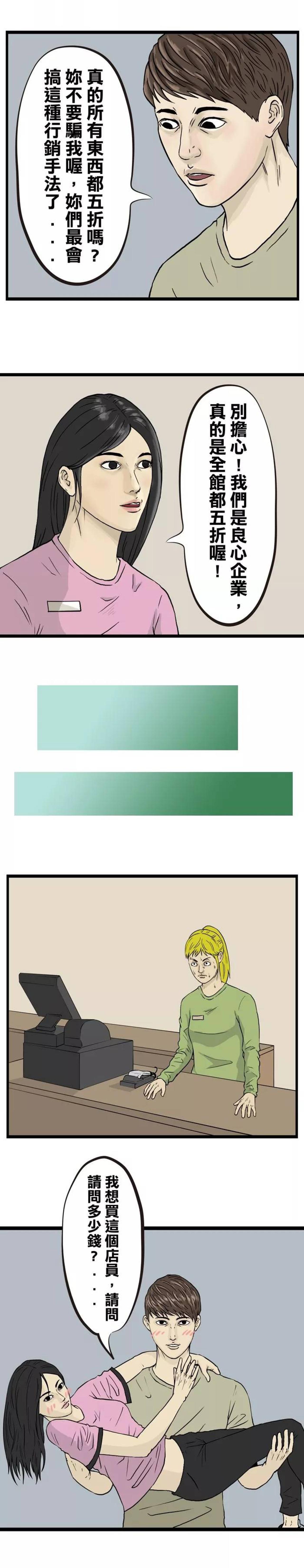 男生在时尚男士流行服饰店中找到了一件自己喜欢的衣服,价格太贵,负担不起,美女店员说正在举办全场五折活动,于是,机智的男生抱起美女店员,就去结账了,看见漂亮的结账店员,见异思迁,花心大萝卜男生,还是被暴揍了。
