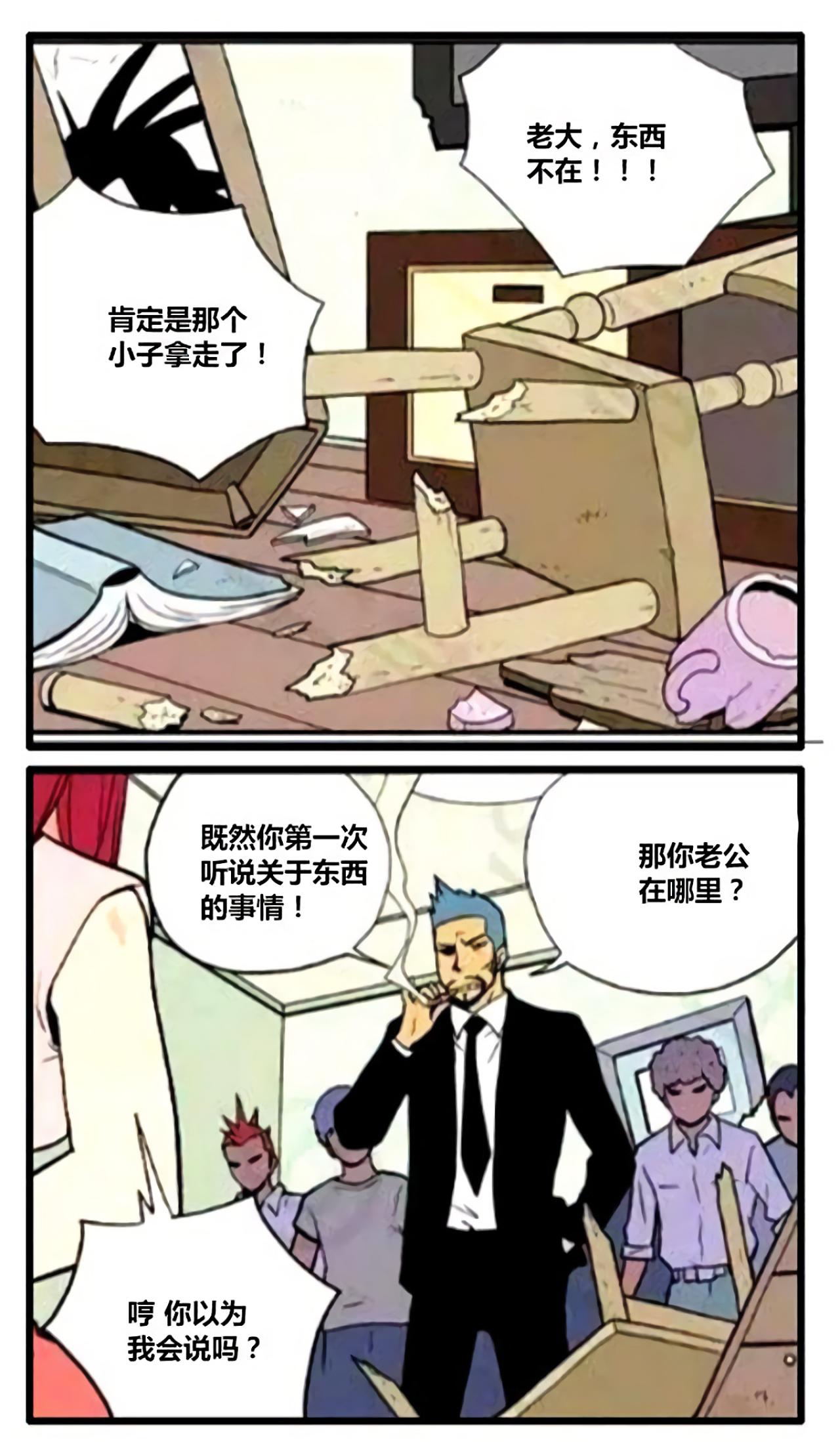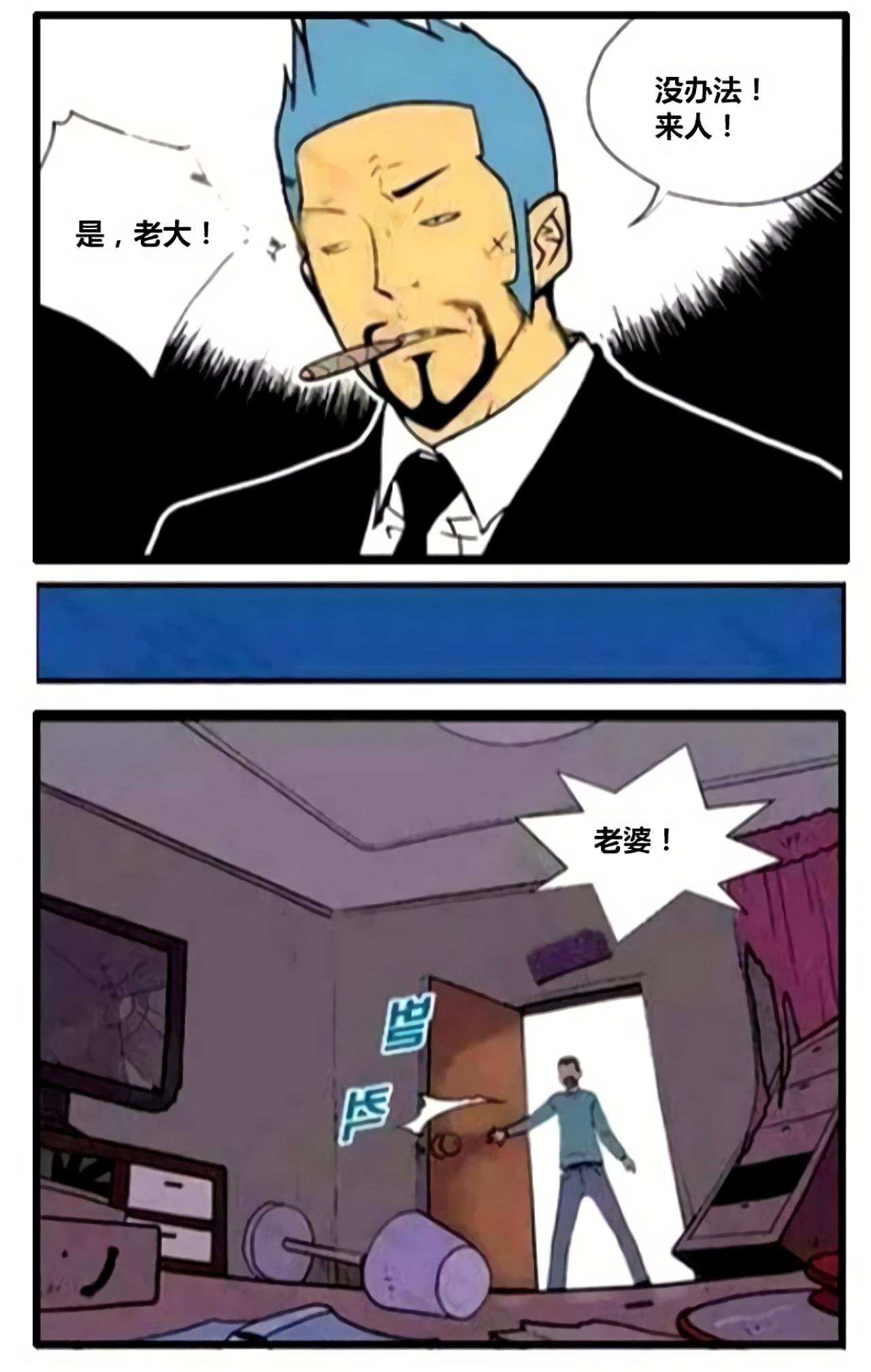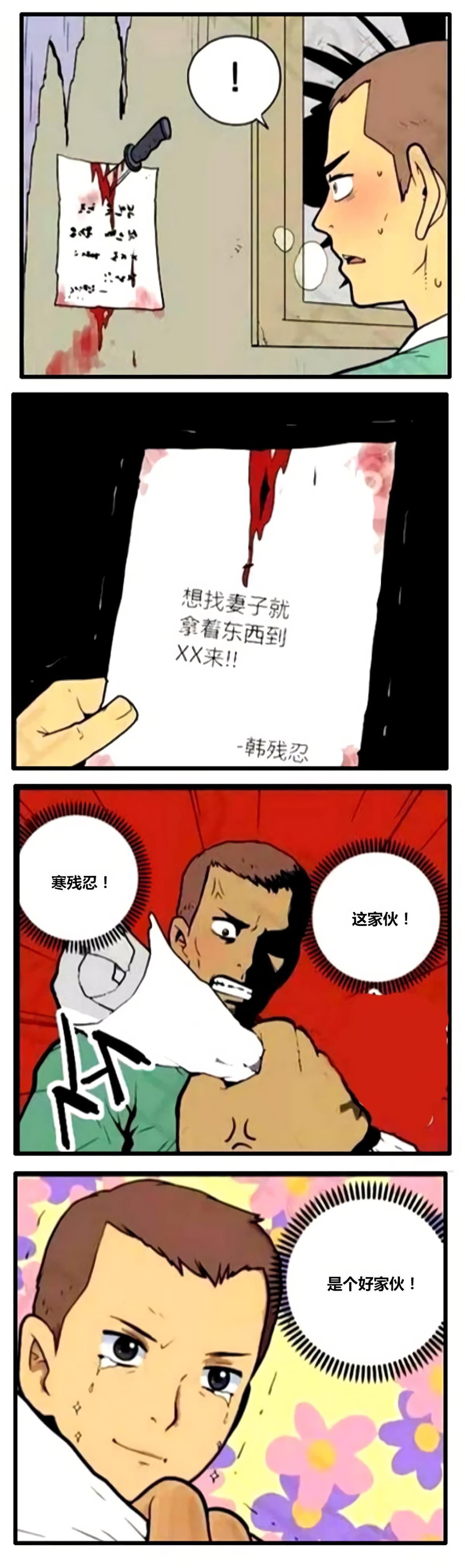 老大来找男主角,发现男主角不在家,只有男主角的妻子在家,询问妻子男主角的去处,妻子不说,于是老大将男主角妻子带走了,留下纸条,想找妻子,就拿着东西来。男主角拿着纸条,露出了感动的微笑。