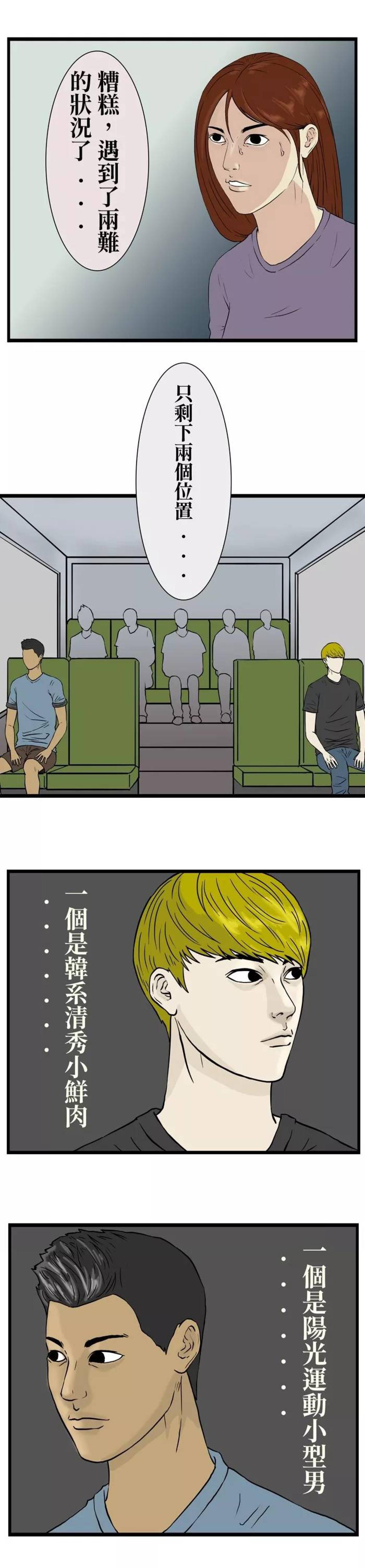 女主角有选择恐惧症,一天她去坐公交车,一上车发现车上有两个男孩,一个是韩系清秀小鲜肉,一个是阳光运动小型男,该坐在谁的身旁呢?面对两难的选择,女主角做出了两全的选择,干脆劈叉吧!