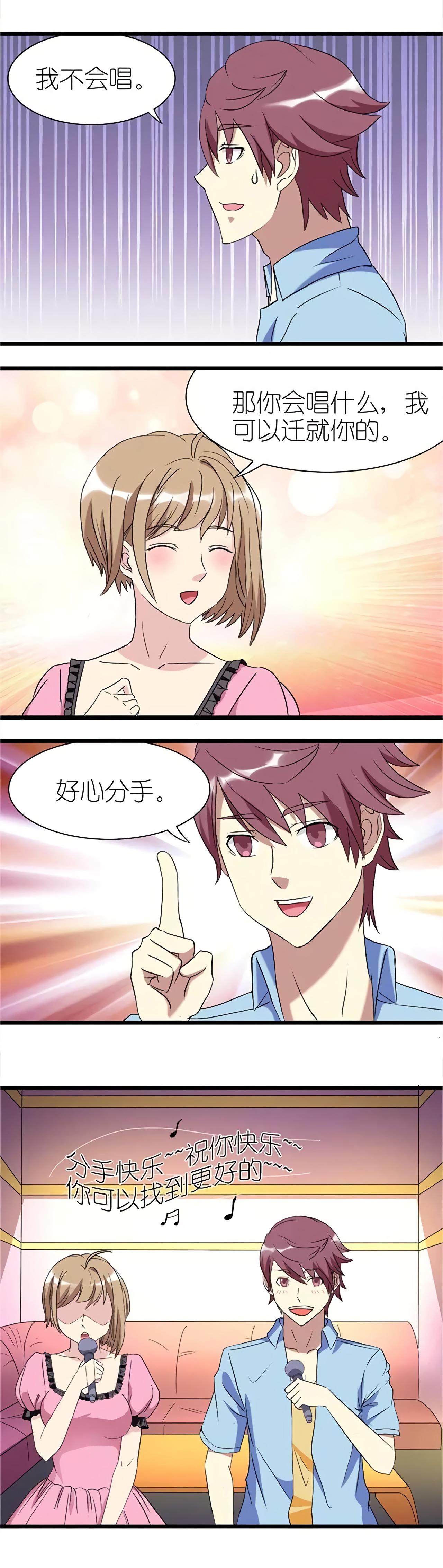 男生和女生一起KTV唱歌,女生邀请男生合唱《今天就要嫁给你》,男生不会唱,女生说,你会唱什么,我可以迁就你的,只要能和你一起唱歌就好啦。于是,男生给女生推荐了他最擅长的歌曲《好心分手》,两人一起唱:分手快乐,祝你快乐,你会找到比我更好的!
