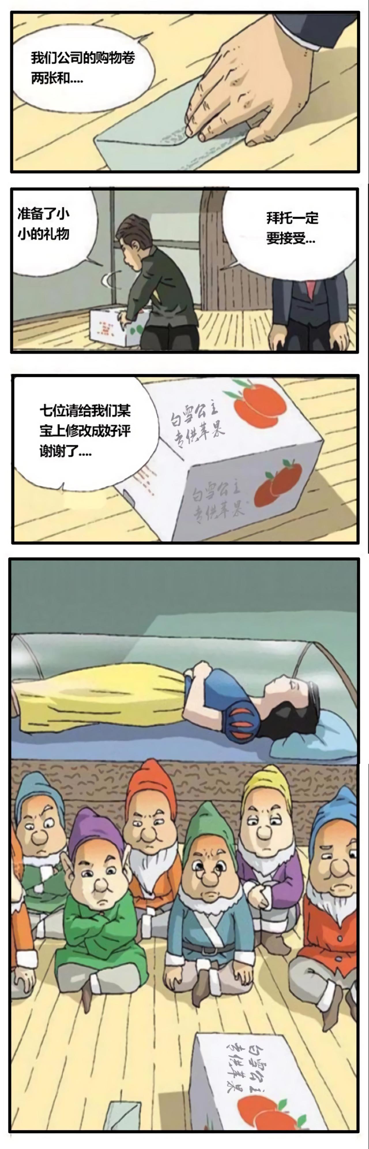 自从白雪公主吃了女巫送来的毒苹果,沉睡不醒,七个小矮人很生气,就给了销售苹果的店铺差评,于是店铺派代表找到了小矮人,赔礼道歉,并告诉他们白雪公主吃的苹果不是他们销售的。但是依然送上两张购物券,还有白雪公主专供苹果一箱。希望他们能够更改差评。