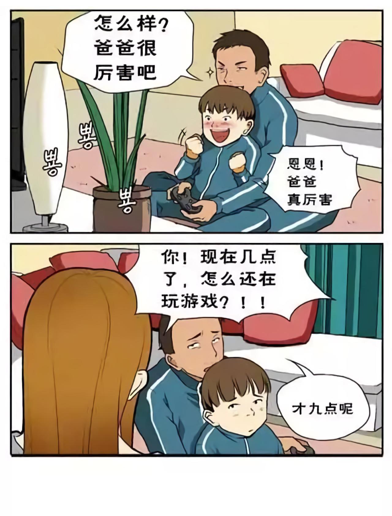 爸爸带着儿子玩游戏被妈妈制止