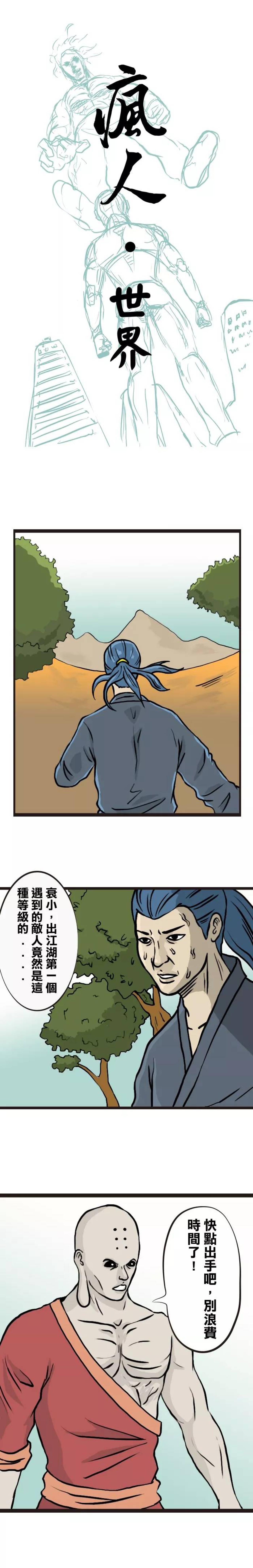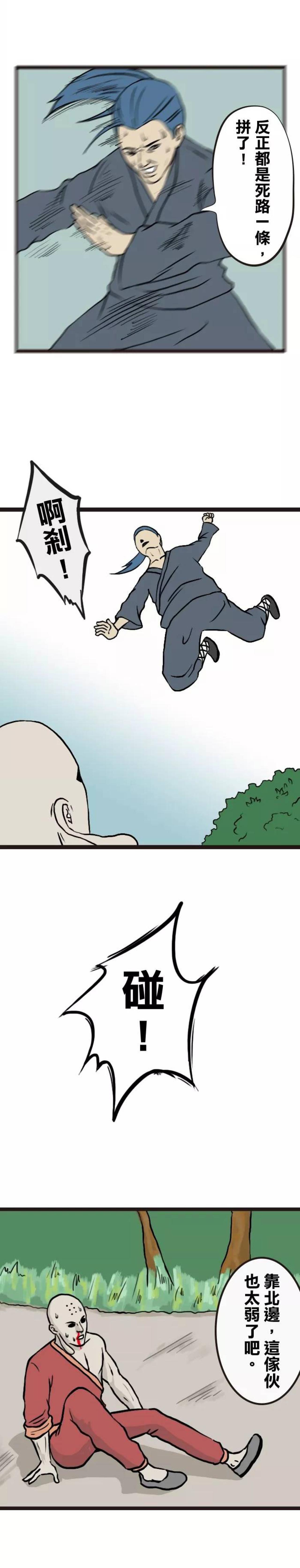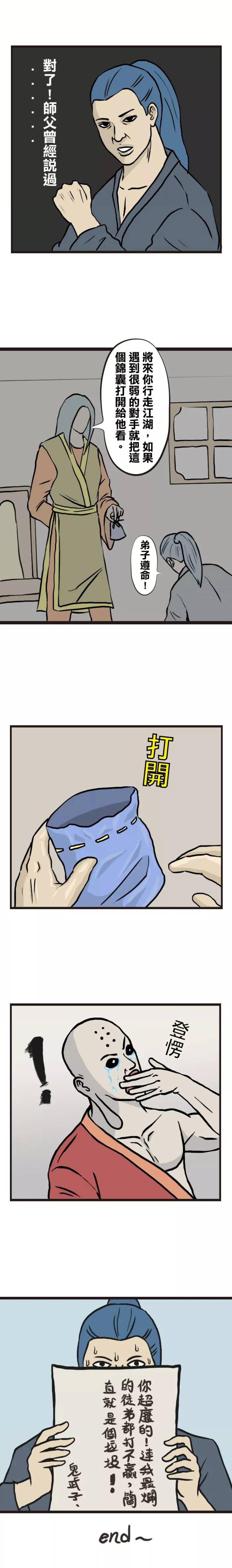 男孩初出江湖,遇见的第一个对手很弱,被男孩一击倒地。他想起来下山前,师父曾给自己一个锦囊,遇到很弱的对手再打开,于是男孩打开了锦囊,给对手看:你超废的,连我最烂的徒弟都打不过。