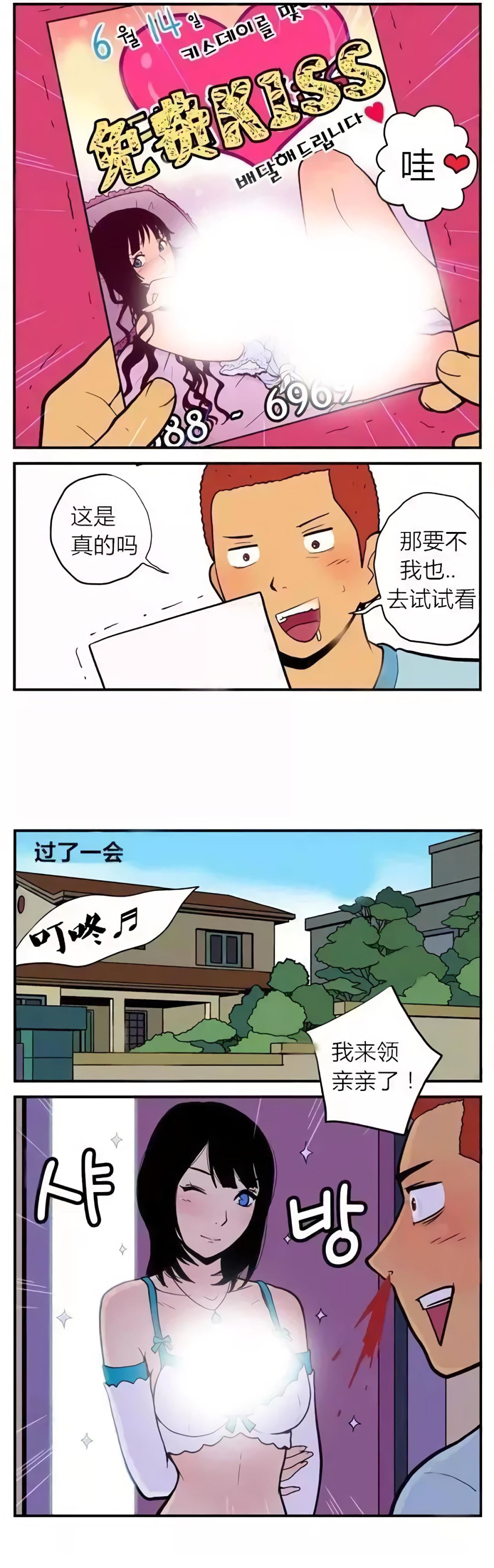 男孩收到一份彩页,凭彩页拨打电话,可免费领取美女的香吻一个。于是男孩打电话,献出了自己的初吻。当男孩感动到留鼻血的时候,旁边的小孩和路人正在盯着他看。