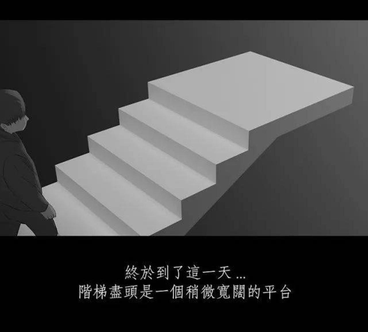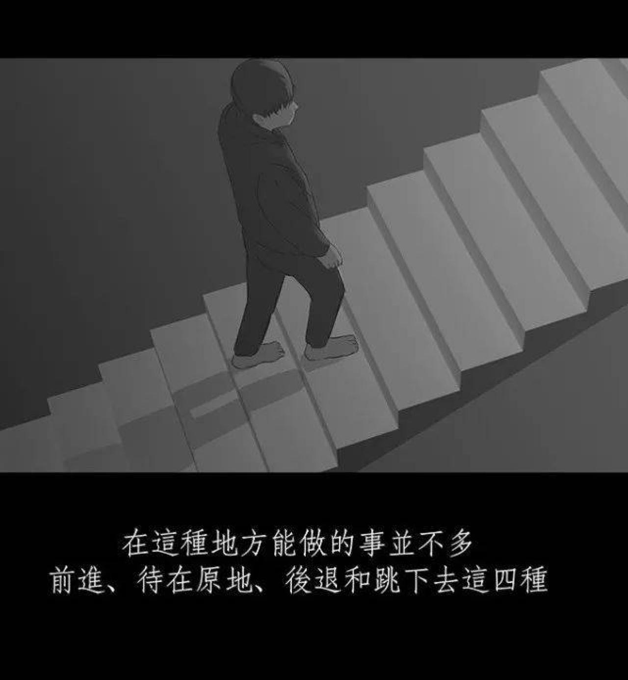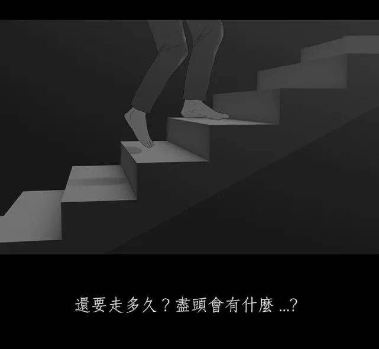 咳咳,男孩一直气喘吁吁,他失去了记忆,已经不知道自己爬了多久的阶梯。阶梯很长,尽头是什么都是未知,男孩只有不断地爬楼梯,稍有落后,就会被身后的怪力老人拍打。终于,男孩抵达了阶梯的尽头,横在阶梯与终点之间,竟然是一道万丈深渊,还有一个系着套圈的绳子。