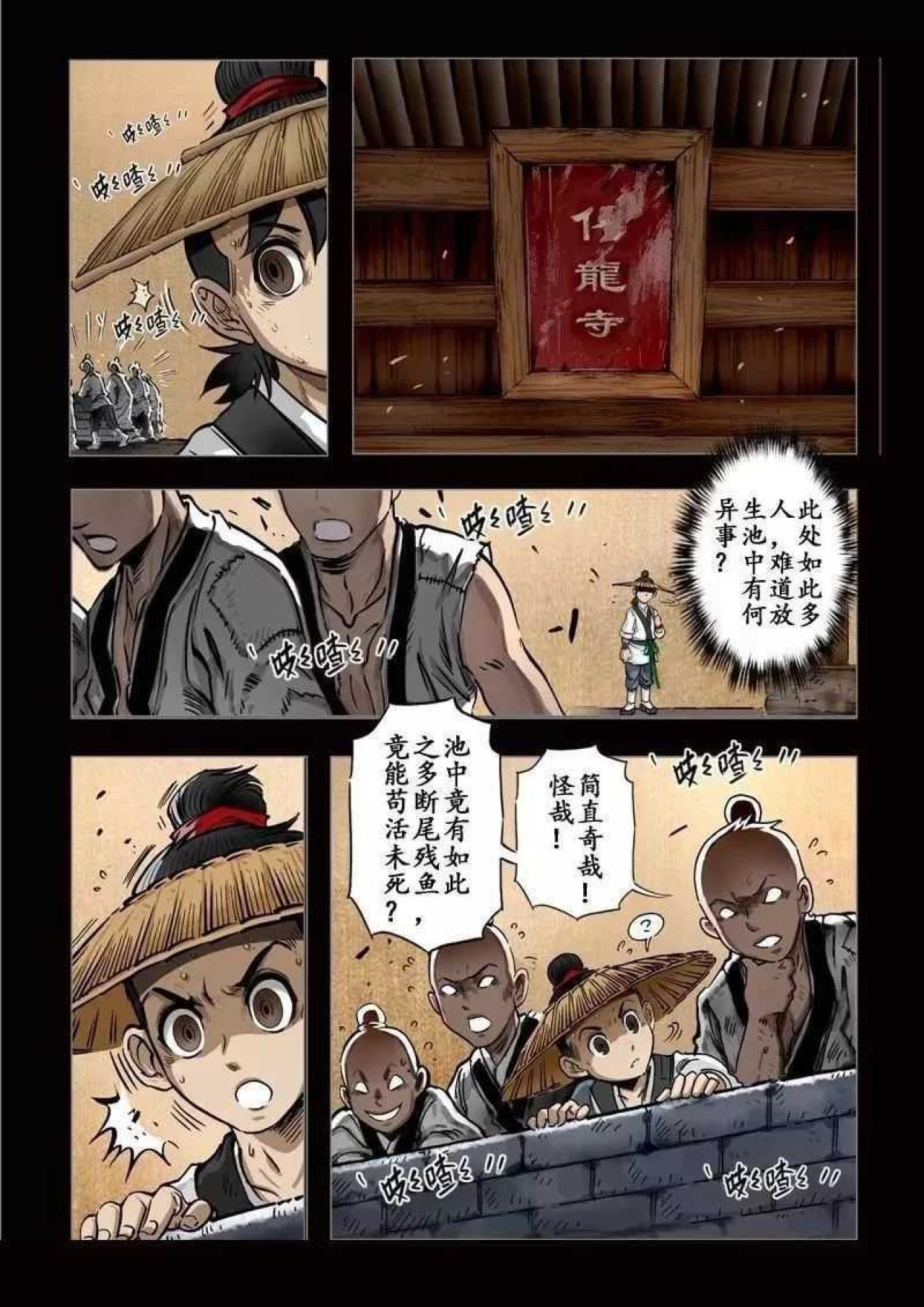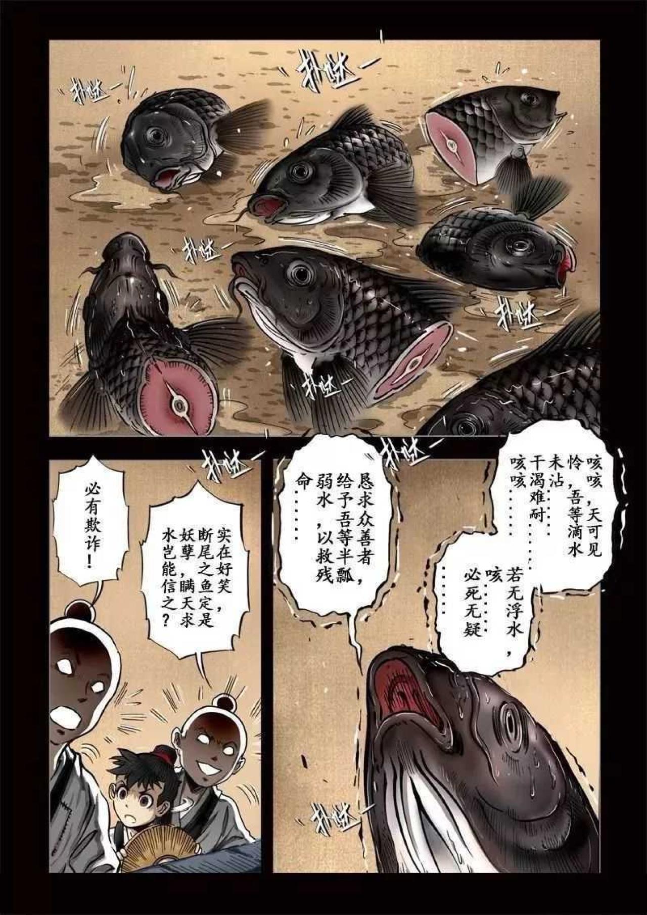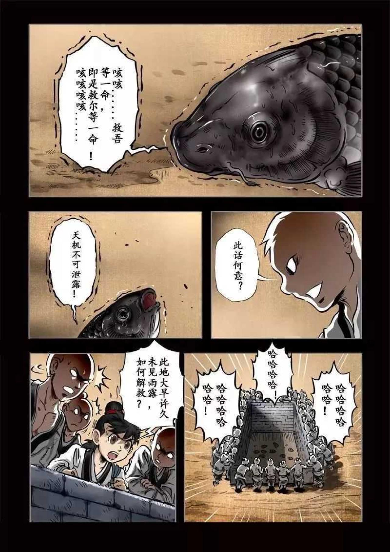 某某年间,大旱无雨,妖风黄沙肆虐,青苗锈土,植被皆枯黄而死。少年路过寺庙,见放生池旁人员聚集,贴近观察,却见池中尽是半腰鱼,奄奄一息,说枯木有水,祈求众善者给予半瓢弱水,然众人不信,更有落井下石者。少年不顾嘲笑,取水救鱼。常行善者,福虽未至,但祸已远。天机不可泄露。