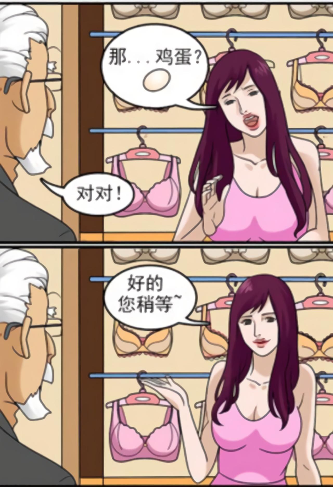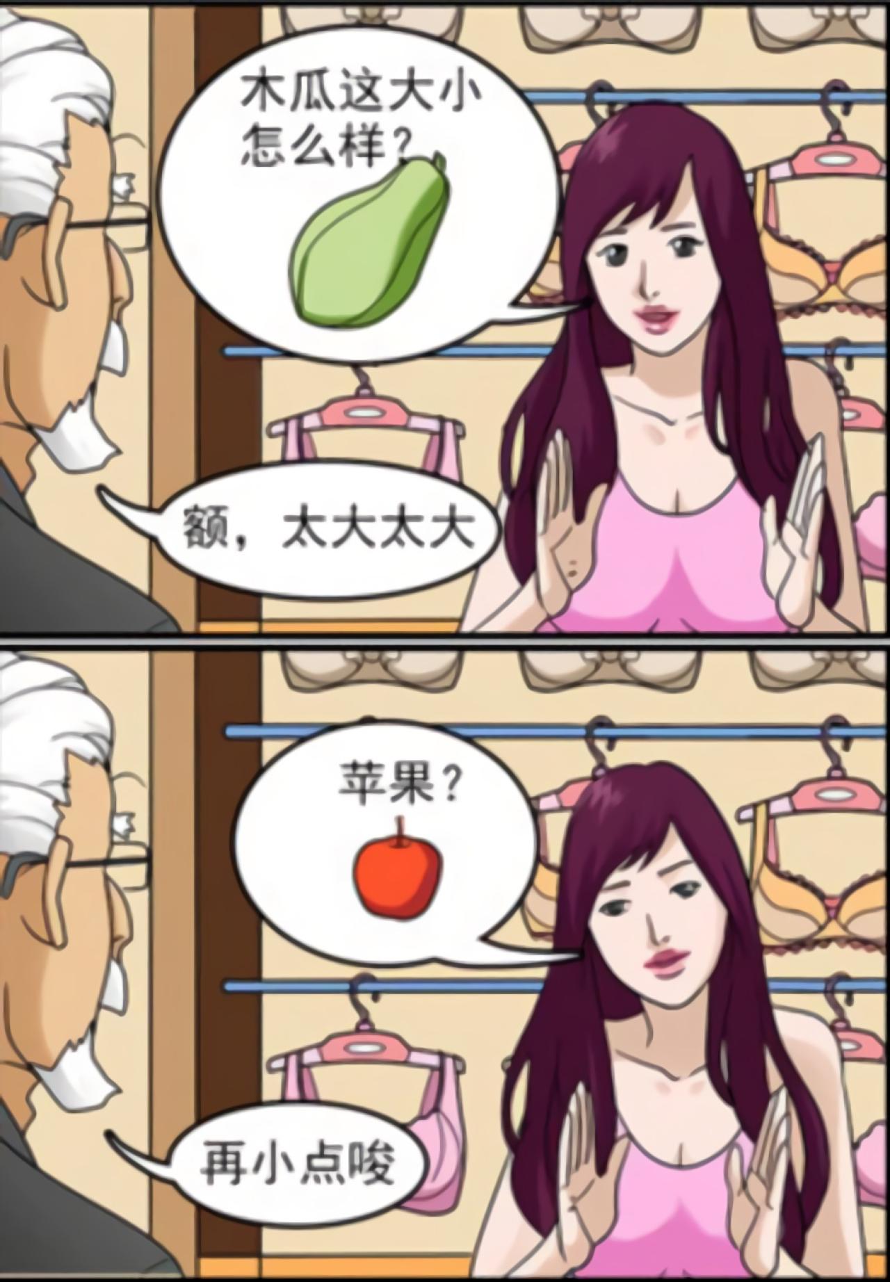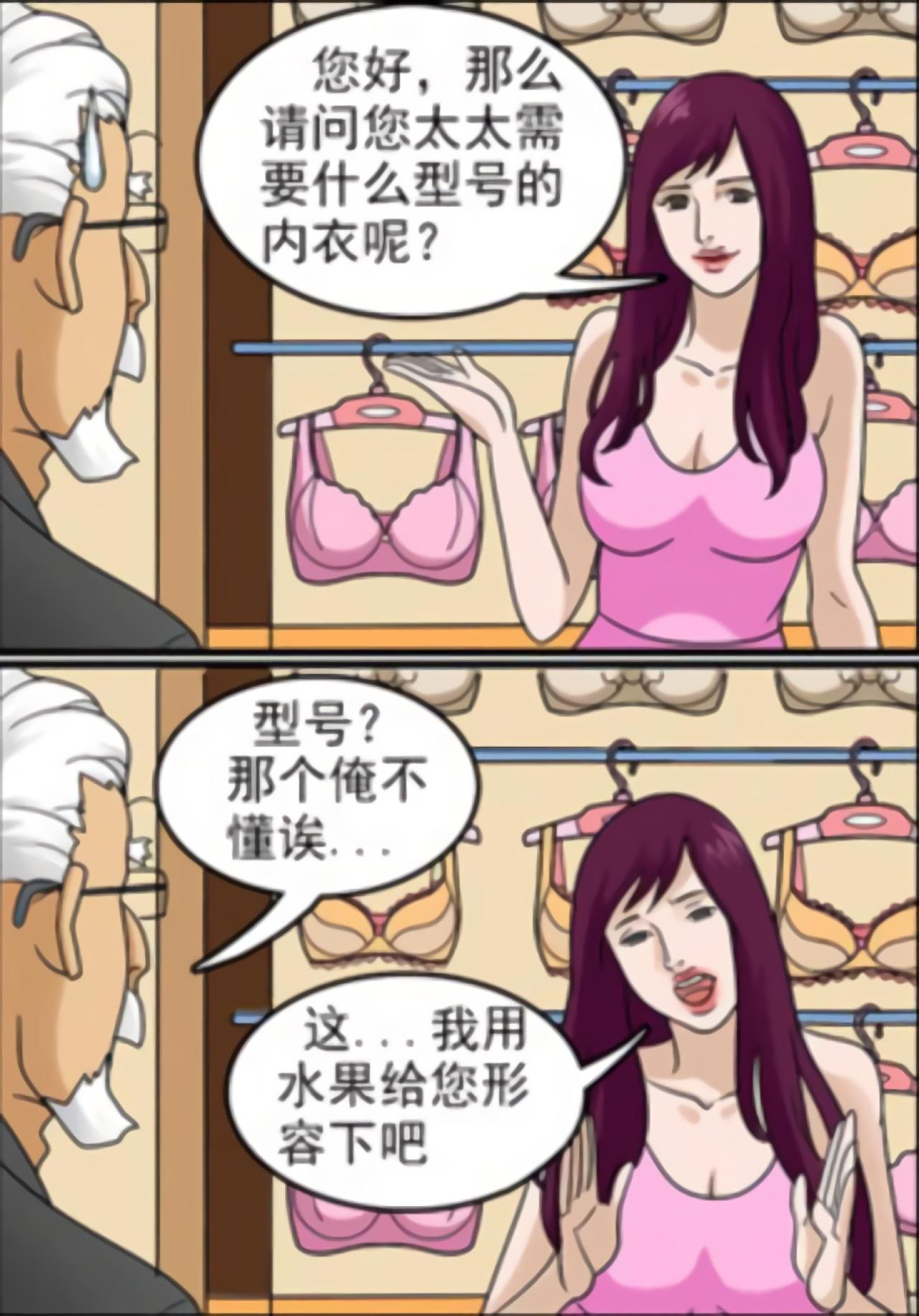 老爷爷要帮太太买内衣,卖内衣的导购小姐询问需要什么样的尺码,老爷爷不懂,导购小姐说用水果来打比方,便于老爷爷理解。先说木瓜,老爷爷觉得太大了,苹果,老爷爷认为还是大,鸡蛋,老爷爷觉得对了,正当导购小姐要拿内衣的时候,老爷爷补充道,是煎过的鸡蛋。