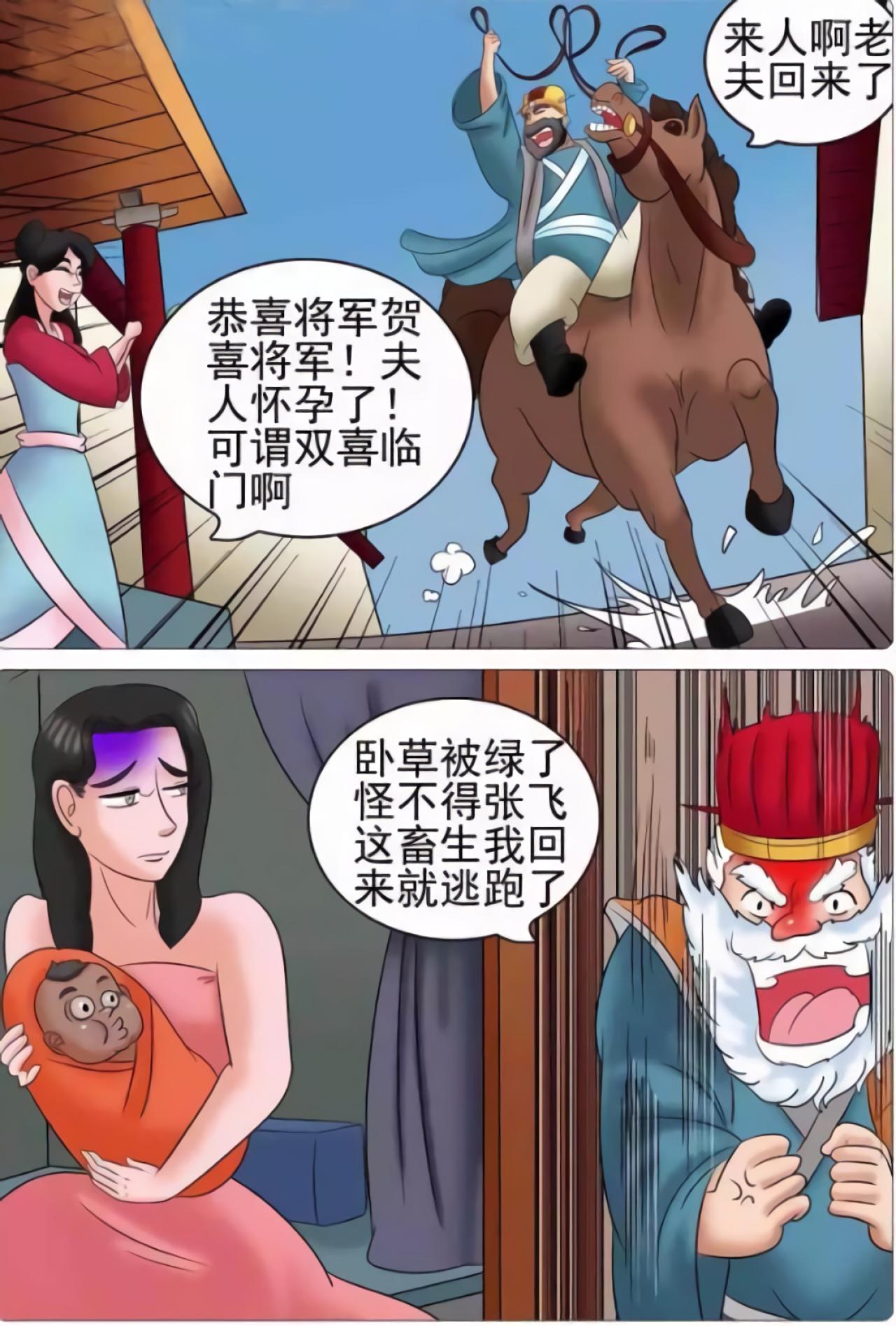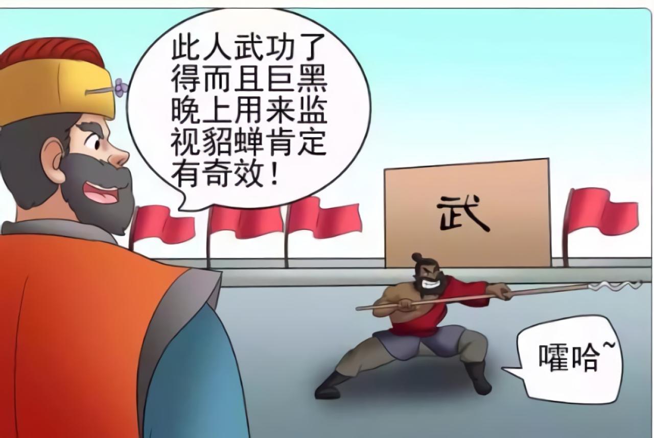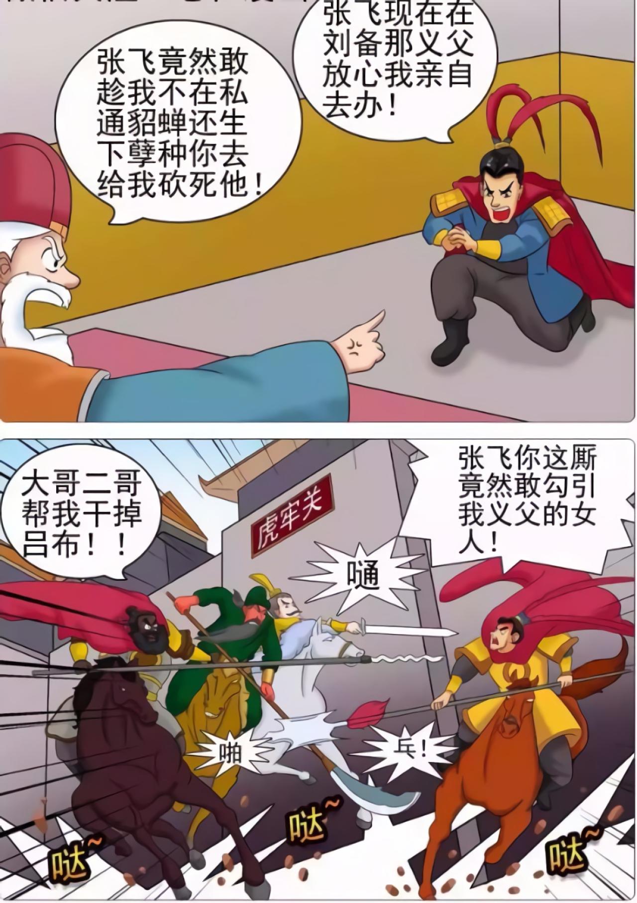 董卓与貂蝉在一起后,每天征战,貂蝉说自己一个人在家里害怕,董卓看张飞武功了得,并且长得很黑,适合在夜里保护貂蝉。一段时间后,貂蝉怀孕生子,生了一个小黑孩,董卓非常生气。于是派吕布讨伐张飞,在城墙外,发生了三英战吕布的故事。本故事纯属虚构,非三国历史哦!